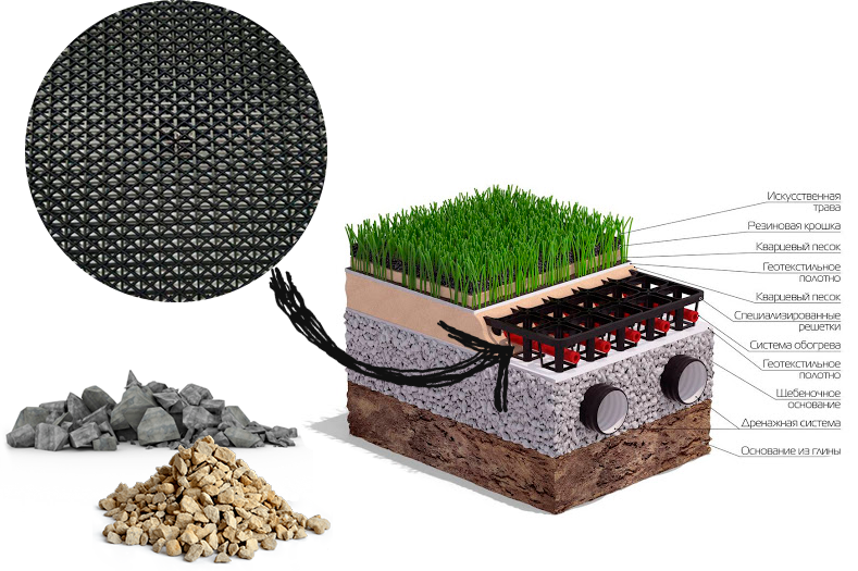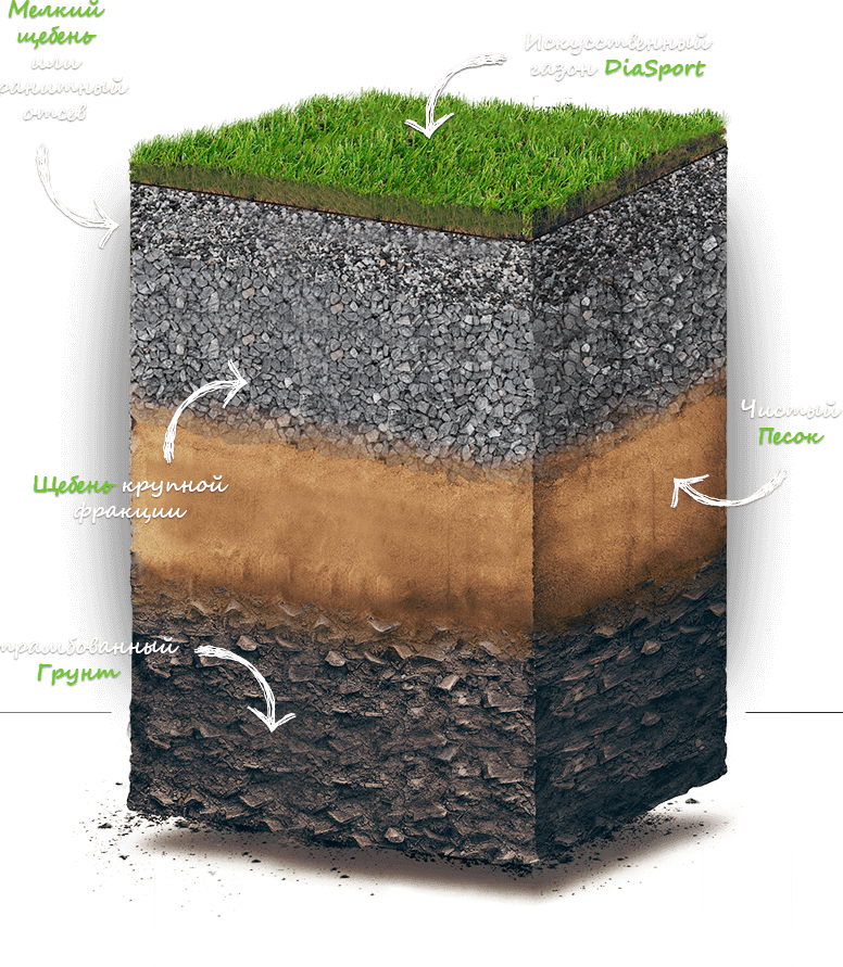 Сперва делаем необходимую выемку грунта, как правило, это 50-60 см и укладываем искусственный газон поверх насыпного основания. Насыпное основание состоит из трех слоев: песок, щебень крупной фракции и мелкий щебень, либо гранитный отсев. При необходимости подготовим основание со всей дренажной системой и ливневкой. А также, при желании клиента, установим подогрев поля. После того как основание тщательно подготовлено, можно приступать к укладке рулонного покрытия. Это тоже мы можем сделать за вас! При необходимости укладываем искусственную траву «под ключ». Вам не придется ни о чем беспокоиться, все работы берем на себя. Почитайте отзывы довольных клиентов. Индивидуально подходим к каждому клиенту, помогаем подобрать материал так, чтобы это было качественно и бюджетно. В нашем ассортименте есть эксклюзивная высококачественная французская искусственная трава торговой марки Eurofield, а также более экономичные варианты китайского производителя.